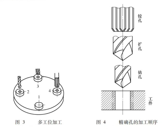 3) 工位。工位是為了完成一定的工序內容,一次裝夾工件后,工件在機床或夾具中占有正確位置過程,即工位。工件每一次安裝至少有一個工位。為了減少安裝次數,常采用多工位夾具、回轉工作臺或在多軸機床上一次安裝后進行多工位加工。多工位加工,可以減少工件安裝次數,縮短輔助時間,提高生產效率。如圖3所示為利用回轉在工作臺一次安裝中順序完成裝卸工件、鉆孔、擴孔和鉸孔多個工位加工的實例。