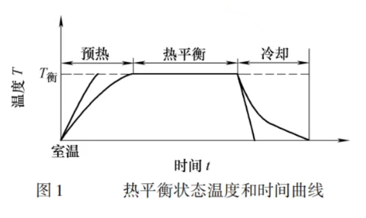 工藝系統受熱源影響,溫度逐漸升高,與此同時,其熱量通過各種傳導方式向周圍散發。當單位時間內的熱量傳入與傳出相等時,溫度不再升高,這時工藝系統就達到熱平衡狀態。在熱平衡狀態下,工藝系統各部分的溫度就保持在一個相對固定的數值上,因而各部分熱變形也就相應地趨于穩定。圖1所示為熱平衡狀態溫度和時間曲線圖。