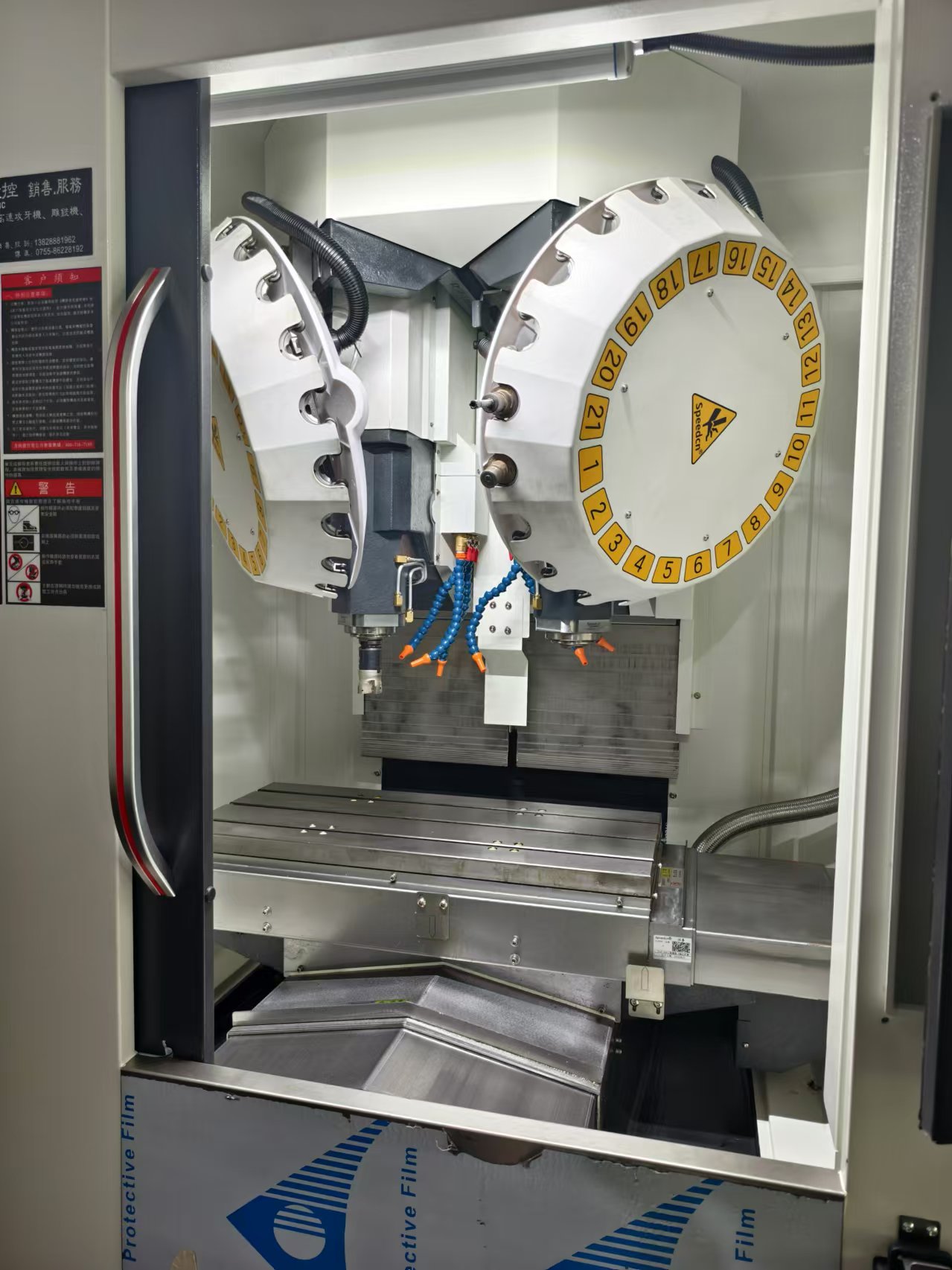 雙主軸加工中心:具有兩個加工機頭、兩個加工臺面以及兩個刀庫,能夠同時對兩個產品進行加工。這種設計顯著提升了生產效率,使得在相同時間內可以完成兩個產品的加工任務。